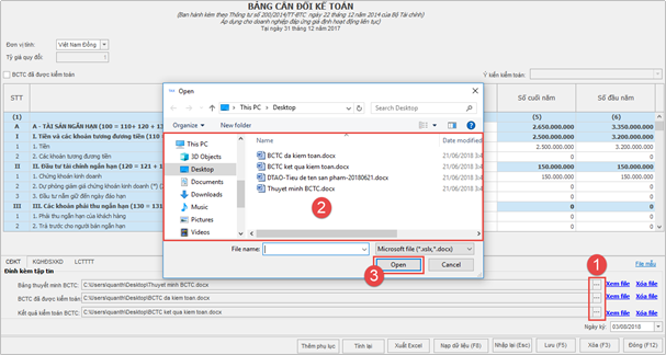 Ứng dụng hỗ trợ đính kèm (1) thêm một số file dữ liệu từ bên ngoài như bảng Cân Đối Tài Khoản, BCTC đã được kiểm toán, thuyết Minh BCTC …; người dùng nhấn chọn vào dấu “…” (1) chọn vị trí lưu và file cần đính kèm (2) để thực hiện đính kèm (3).
