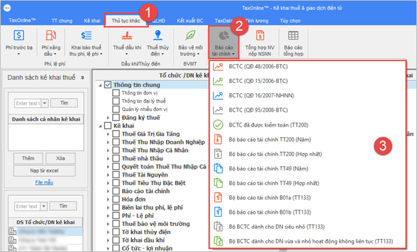 Bước 1: Trên thanh tiêu đề chọn vào mục “Thủ tục khác” (1) > “Báo cáo tài chính” (2) > tùy theo mô hình hoạt động của đơn vị mà chọn đúng mẫu tờ khai để nhập dữ liệu (3).